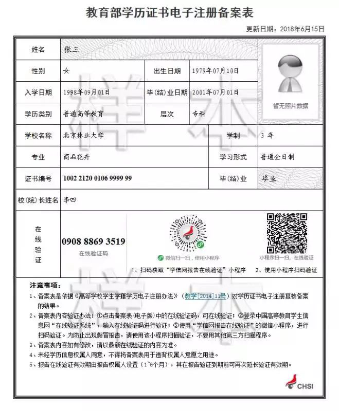 2.《教育部學(xué)歷證書電子注冊(cè)備案表》的樣本如圖: