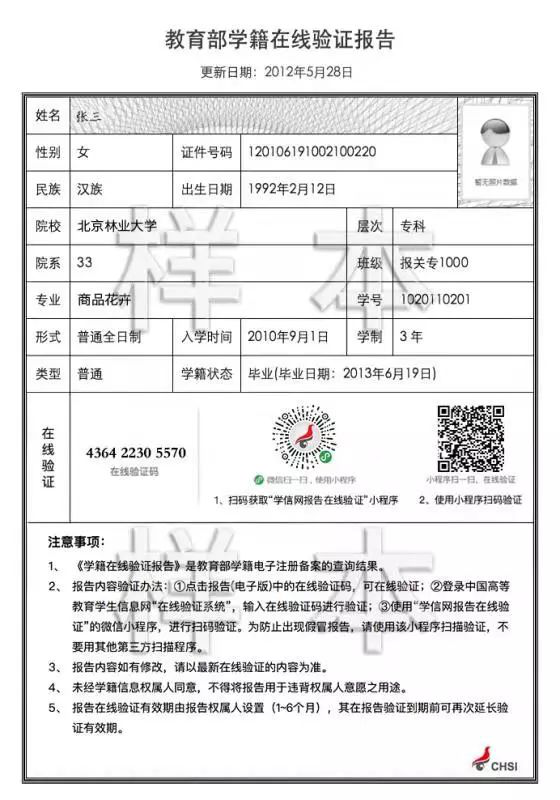 《教育部學(xué)籍在線驗(yàn)證報(bào)告》的樣本如圖: