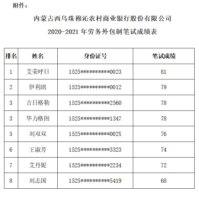 內(nèi)蒙古西烏珠穆沁農(nóng)村商業(yè)銀行股份有限公司委托內(nèi)蒙古才路人力資源服務(wù)有限公司,組織完成了內(nèi)蒙古西烏珠穆沁農(nóng)村商業(yè)銀行股份有限公司2020-2021年勞務(wù)外包制招聘考試筆試考務(wù)工作?,F(xiàn)將內(nèi)蒙古西烏珠穆沁農(nóng)村商業(yè)銀行股份有限公司2020-2021年勞務(wù)外包制招聘考試筆試成績(jī)進(jìn)行公示。咨詢電話:0471-3307904。